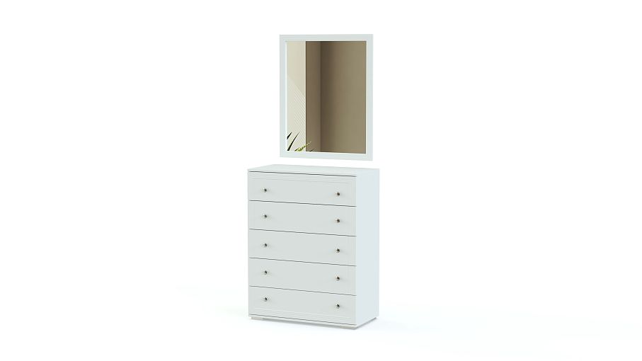 Комод Карина 2 BMS подходит для меблировки небольших помещений благодаря компактным размерам. Модель оборудована пятью выдвижными ящиками для хранения домашнего текстиля и разнообразных бытовых мелочей, а дополнение в виде навесного зеркала позволяет использовать его как туалетный столик. Выполненный из материалов в светлых белых тонах, комод декорирован неброской рамочной фрезеровкой и оснащен ручками-кнопками. Купить комод Карина 2 BMS приглашаем в наш интернет-магазин с выбором цвета и фурнитуры.