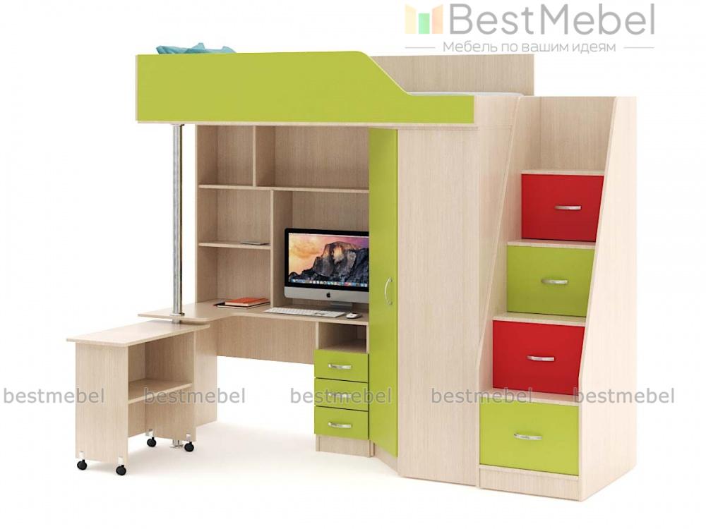 Детская кровать-чердак Мерабель 1 BMS – отличная модель с потрясающей функциональностью. В комплект входят все элементы, необходимые для гармоничного развития малыша. Большой шкаф интересной формы вместит кучу детских вещей. На спальное место, скрытое за фигурной панелью, нужно забираться по надежной лестнице – тумбе. Её вместительные ступени станут домом для многочисленных игрушек и прочих детских богатств. Рабочий стол имеет полный арсенал для полноценного учебного процесса: это и полочки для книг, и тумба с ящиками для тетрадок и канцелярских мелочей. Обратите внимание на пристройку к столу, которая легко крутится на никелированной опоре, при необходимости увеличивая рабочую поверхность стола почти вдвое. Ребенок с удовольствием будет раскладывать свои вещи по полочкам, поддерживая порядок в своем собственном мирке. Купить детскую кровать – чердак Мерабель 1 BMS по минимальной цене можно на нашем сайте.