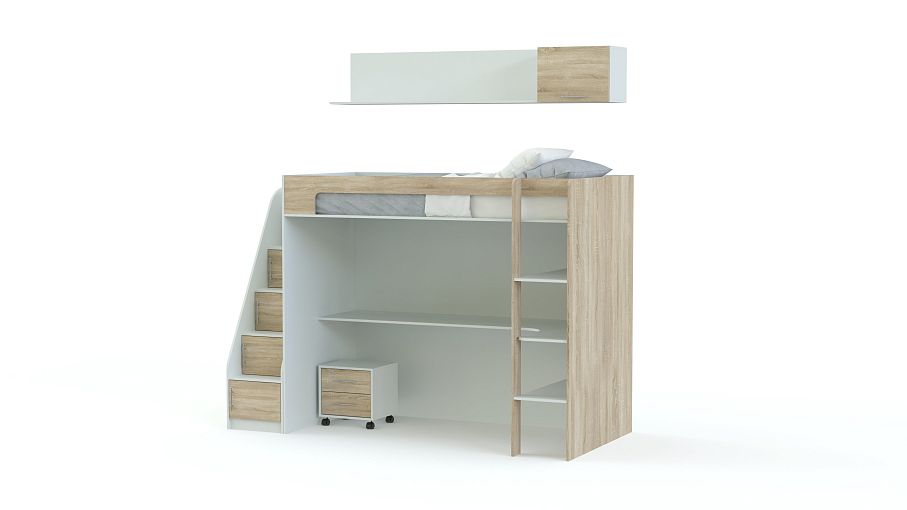Кровать-чердак Лилия 1 BMS идеально подходит для меблировки современной детской, позволяя создать актуальный, визуально легкий и функциональный интерьер. Модель оборудована спальным местом с защитным бортиком, устойчивой лестницей, просторной столешницей в нише и дополнена навесной книжной полкой и мобильной тумбой с выдвижными ящиками для канцелярских мелочей. В оформлении эффектно сочетаются контрастные цвета – белый и с текстурой дерева. Купить кровать-чердак Лилия 1 BMS приглашаем выгодно в наш интернет-магазин.