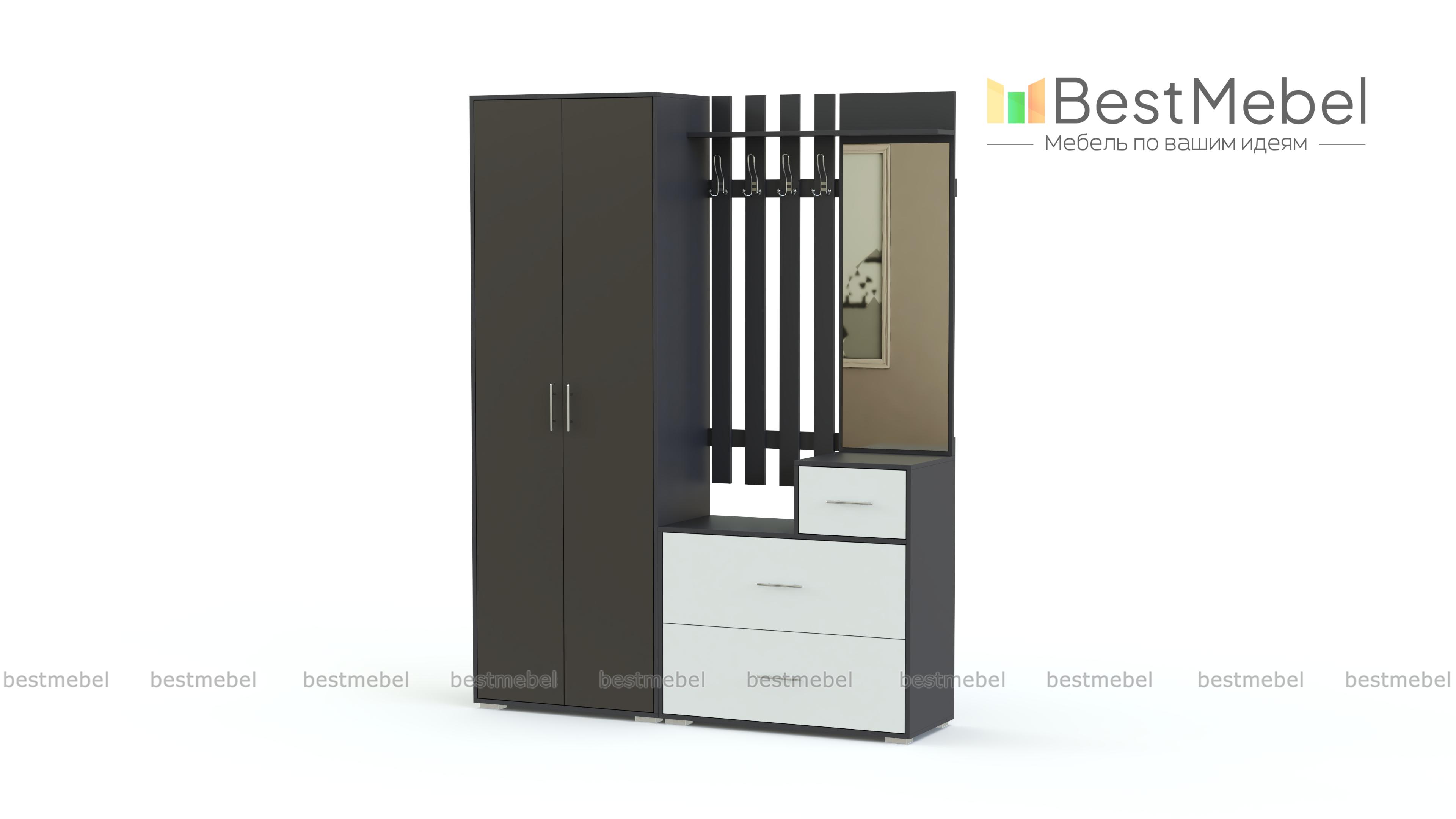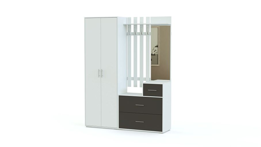 Стенка-прихожая «Идеал 24» BMS – стенка лаконичной формы, которая особенно выигрышно смотрится в контрастном сочетании нескольких цветов и фактур. Белого цвета корпус дополняют белые дверцы распашного платяного шкафа и темные серые фасады тумбы. Элемент с зеркалом и панелью для верхней одежды придает всей конструкции визуальную легкость. Купить стенку-прихожую «Идеал 24» BMS, подобрав идеальное для интерьера цветовое решение, вы сможете в нашем интернет-магазине.