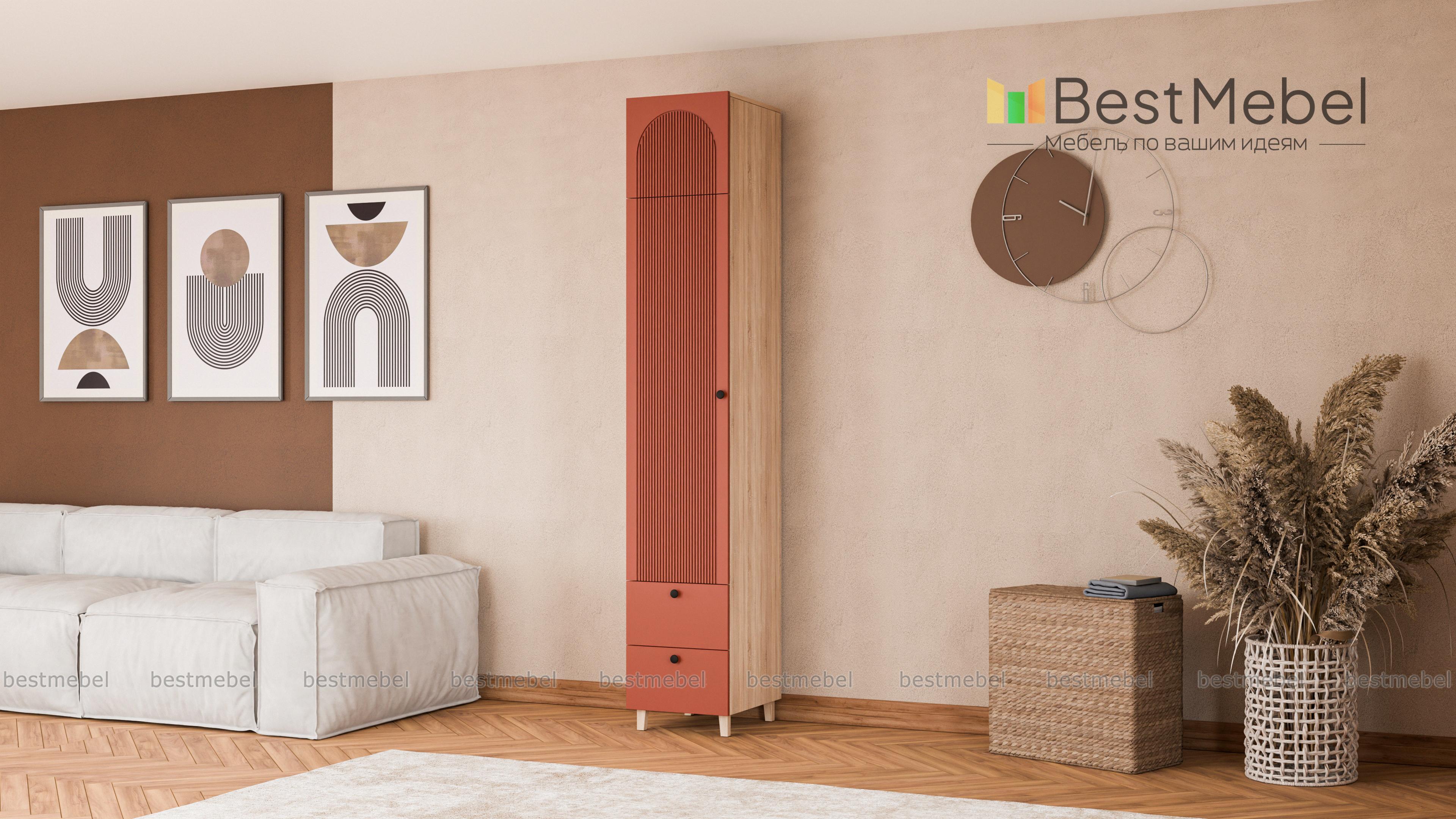 Шкаф-пенал Рене 14 BMS предлагает для хранения не только стандартное распашное отделение, но и два выдвижных ящика снизу, а также антресоль. Продуманная комплектация позволяет легко поддерживать порядок в вещах, а размеры пенала оптимальны для комнат малого метража. Для стильного вида — темный рифленый фасад с круглыми ручками и высокие опоры оттенка светлого дерева. Купить шкаф-пенал Рене 14 BMS, изготовленный по вашим размерам, приглашаем на сайт нашего интернет-магазина.