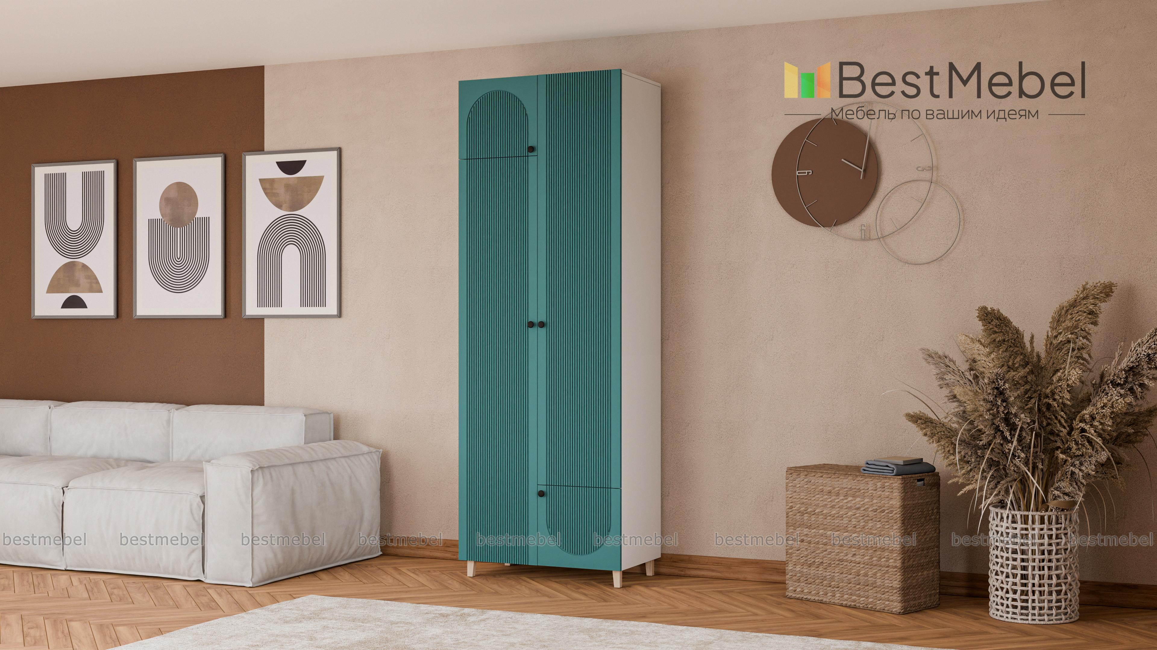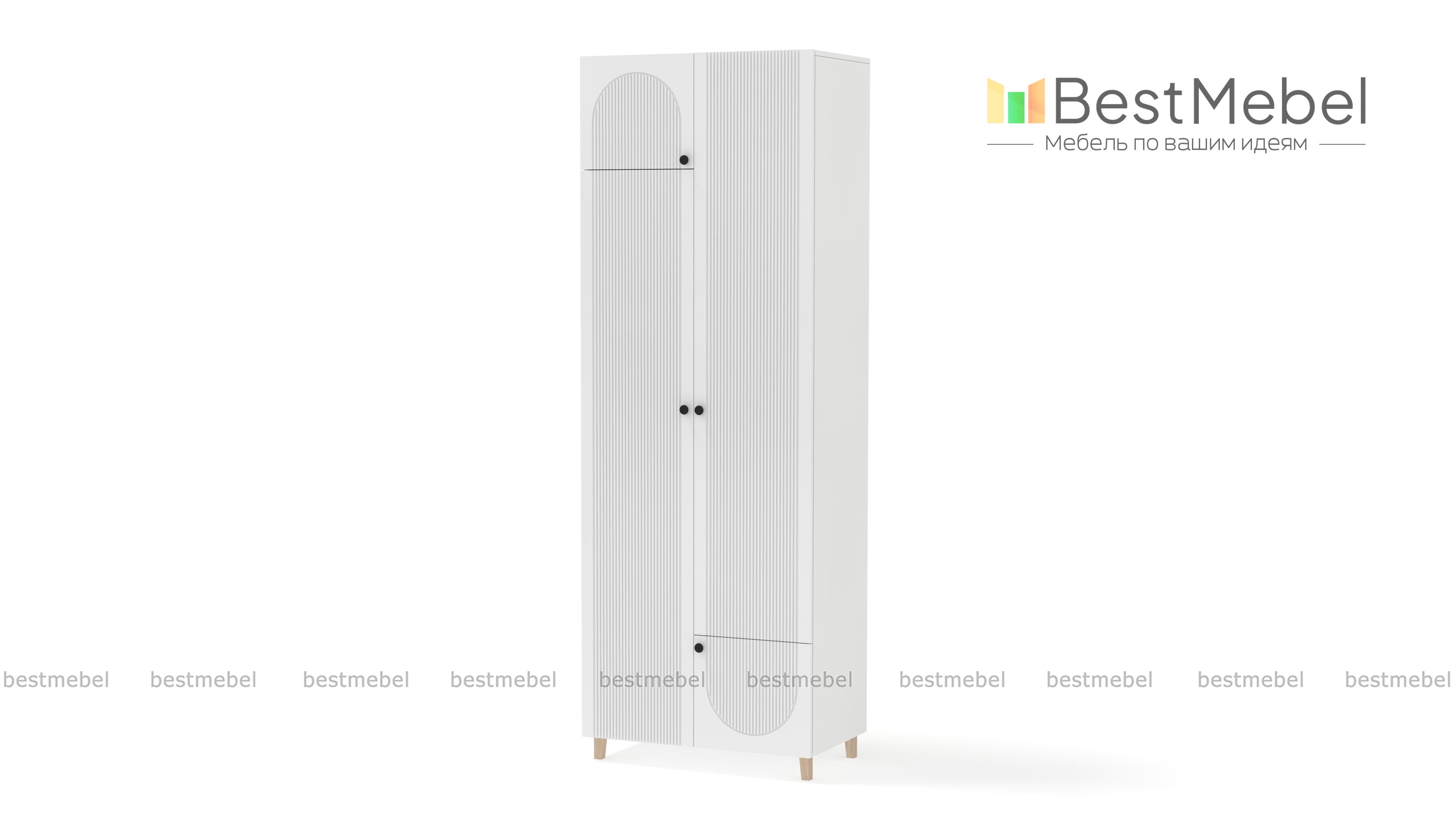 Шкаф распашной Рене 20 BMS компактен и прекрасно впишется в комнаты малого метража: спальни, детские и прихожие. Для более удобного хранения двухдверная модель оборудована дополнительными малыми распашными секциями — сверху и снизу. Прочный фасад из МДФ украшает акцентная фрезеровка, высокие ножки шкафа выполнены в оттенке светлого дерева Купить шкаф распашной Рене 20 BMS, изготовленный по индивидуальным размерам, приглашаем к нам в интернет-магазин.