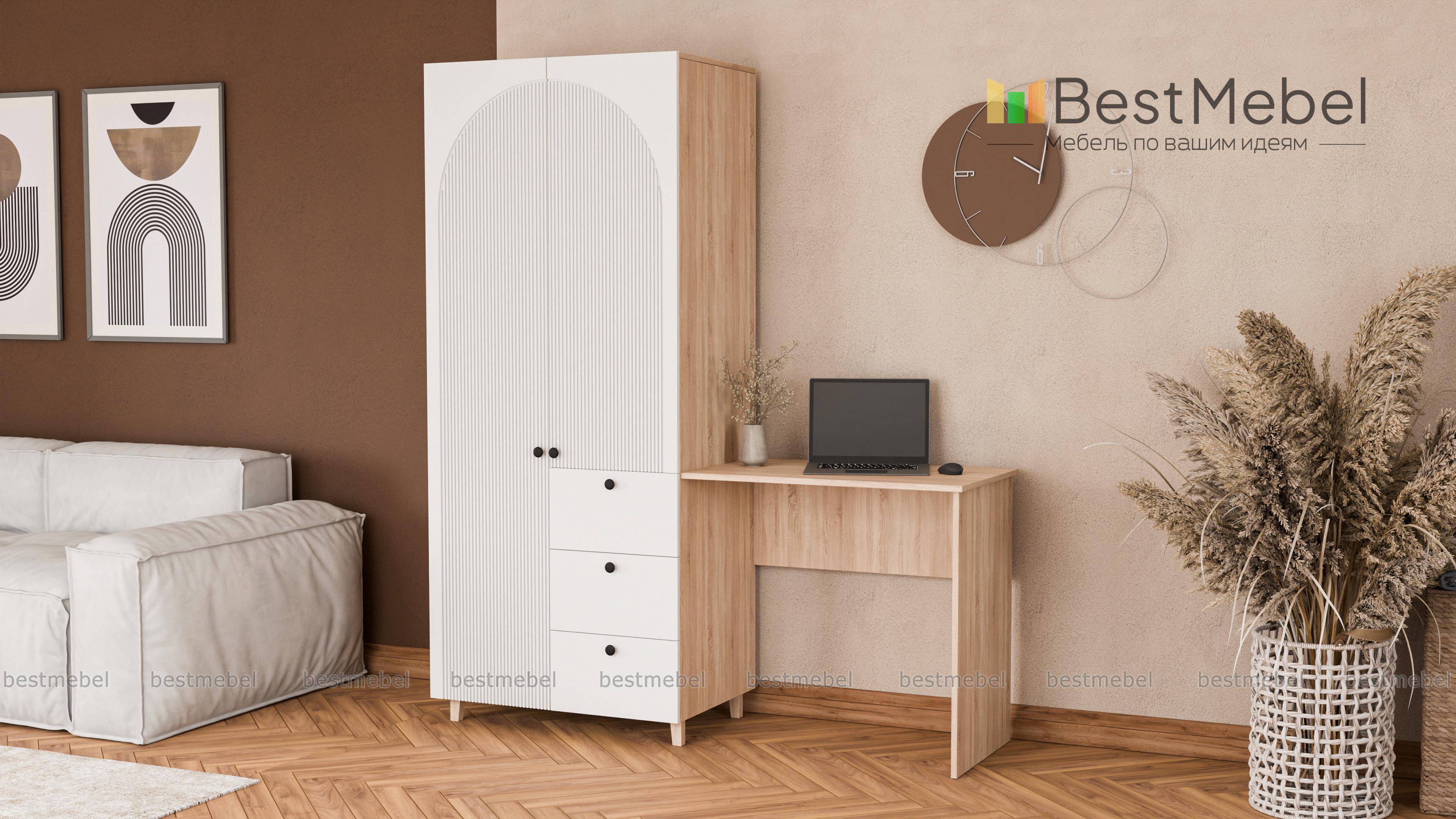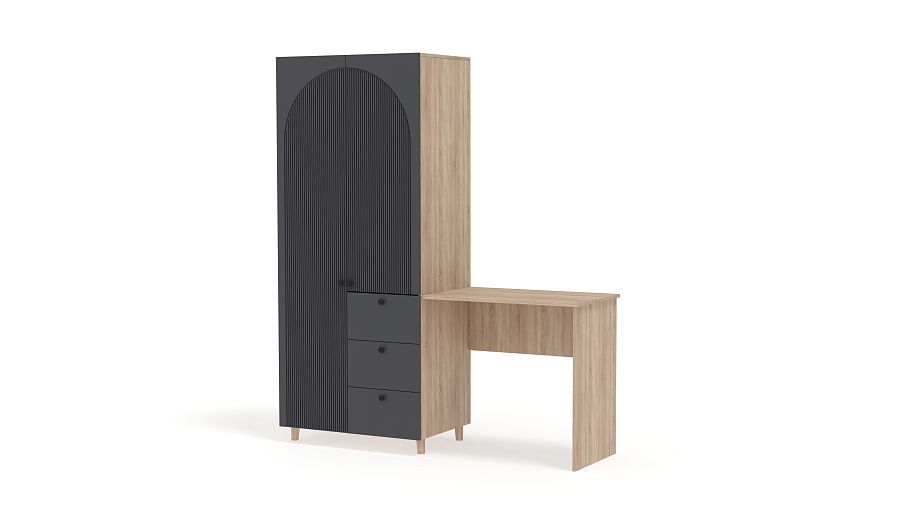 Шкаф со столом Вивьен 4 BMS значительно экономит пространство небольшой комнаты. Компактный гардероб с распашными дверцами и рядом из трех выдвижных ящиков объединен со столиком, удобным для учебы, работы и творчества. Стильный дизайн с высокими опорами, фрезерованной отделкой фасада и трендовыми оттенками украсит интерьер современной квартиры. Купить шкаф со столом Вивьен 4 BMS вы сможете в нашем интернет-магазине с изготовлением по индивидуальным размерам.