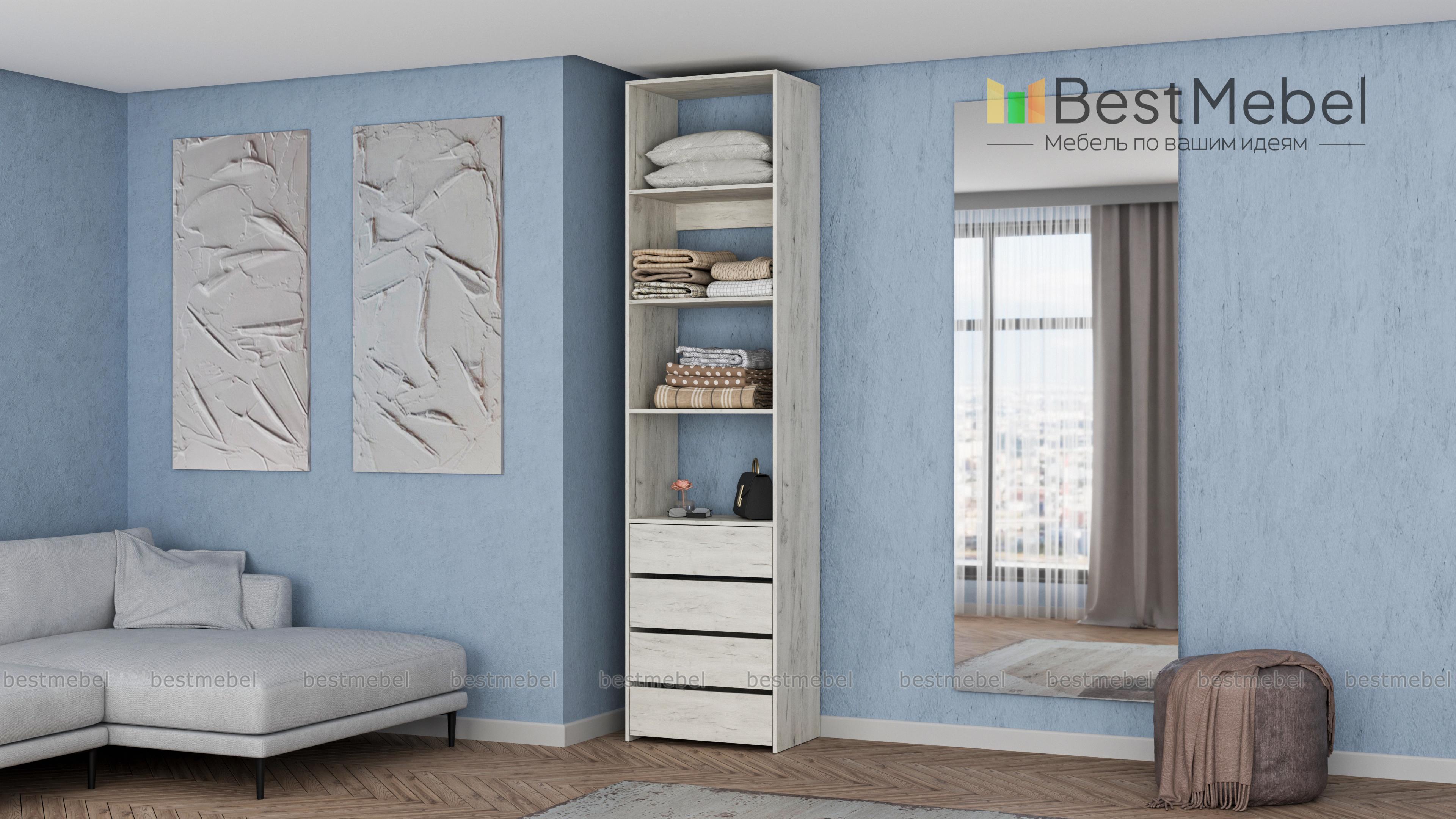 Стеллаж для одежды Мирта 35 BMS может дополнить другие стеллажи серии или использоваться самостоятельно. Три бельевые полки сверху дополнены четырьмя выдвижными ящиками для трикотажа, аксессуаров и прочих мелких вещей. Узкий стеллаж легко вписывается в ниши, маленькие спальни, прихожие или гардеробные, решая проблему ограниченного пространства. Купить стеллаж для одежды Мирта 35 BMS приглашаем в наш интернет-магазин в любом размере и оттенке из каталога.