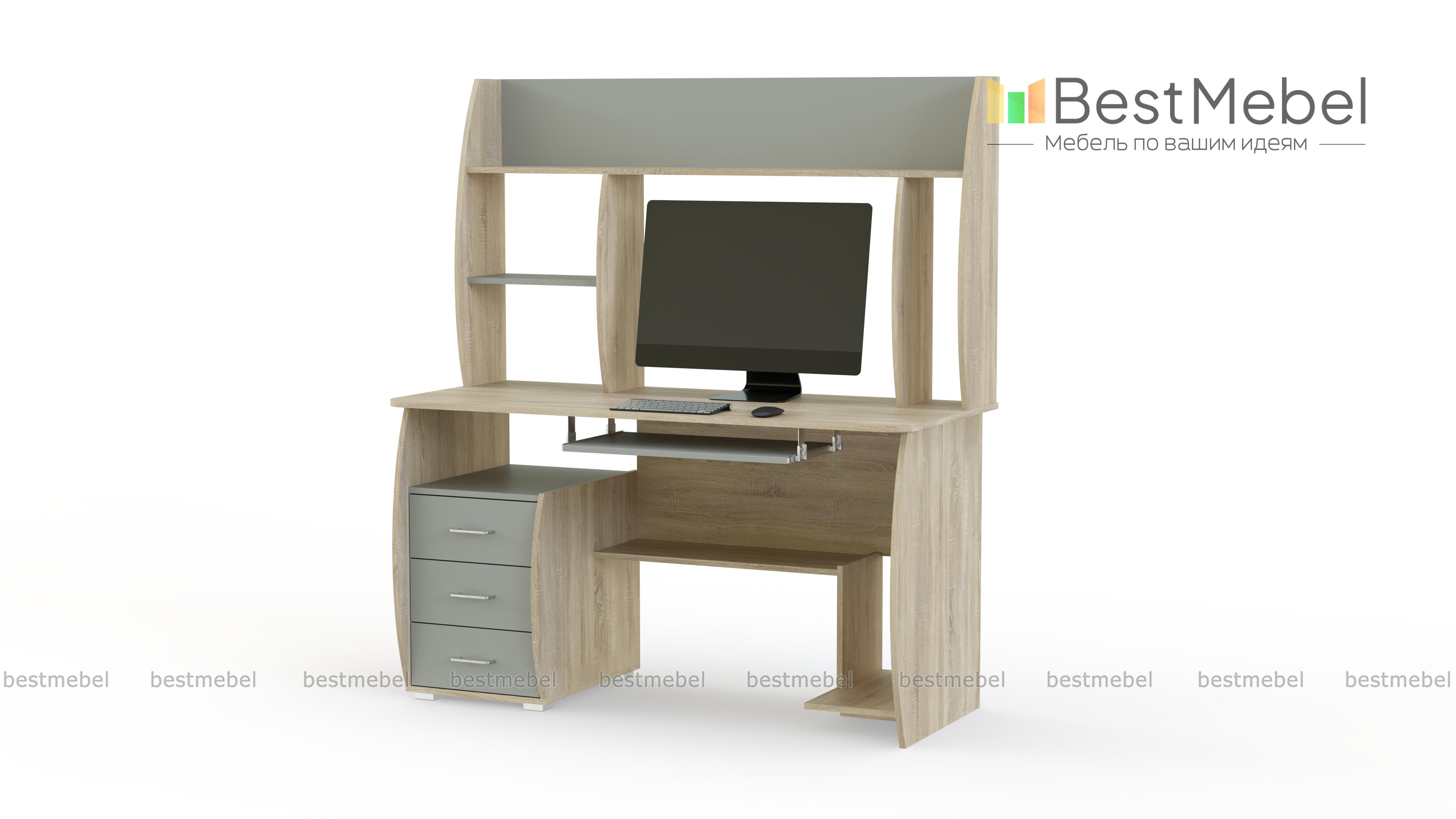 Компьютерный стол СК 16 BMS отличается функциональным и эргономичным дизайном. Конструкцией предусмотрены надстройка, позволяющая разместить рабочие материалы и сопутствующие аксессуары, а также полочка для клавиатуры, тумба с тремя выдвижными ящиками, нижняя полка и ниша под системный блок. Стильная особенность дизайна - чуть скругленные боковины и перегородки. Купить компьютерный стол СК 16 BMS вы сможете в нашем интернет-магазине, подобрав цвет и фурнитуру.