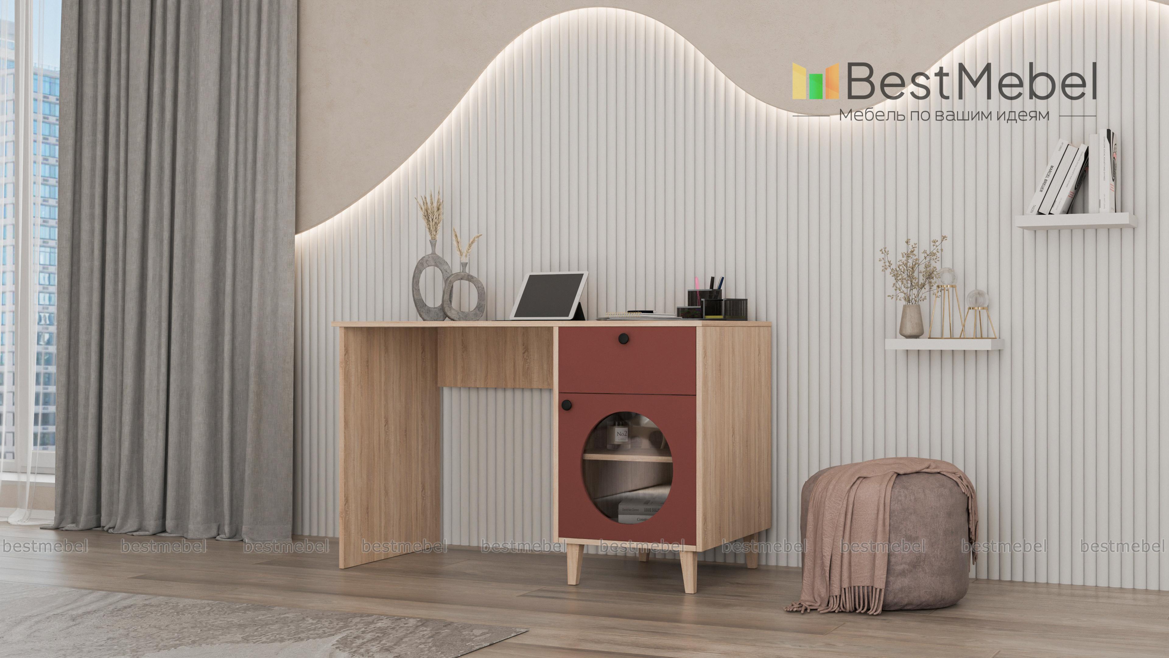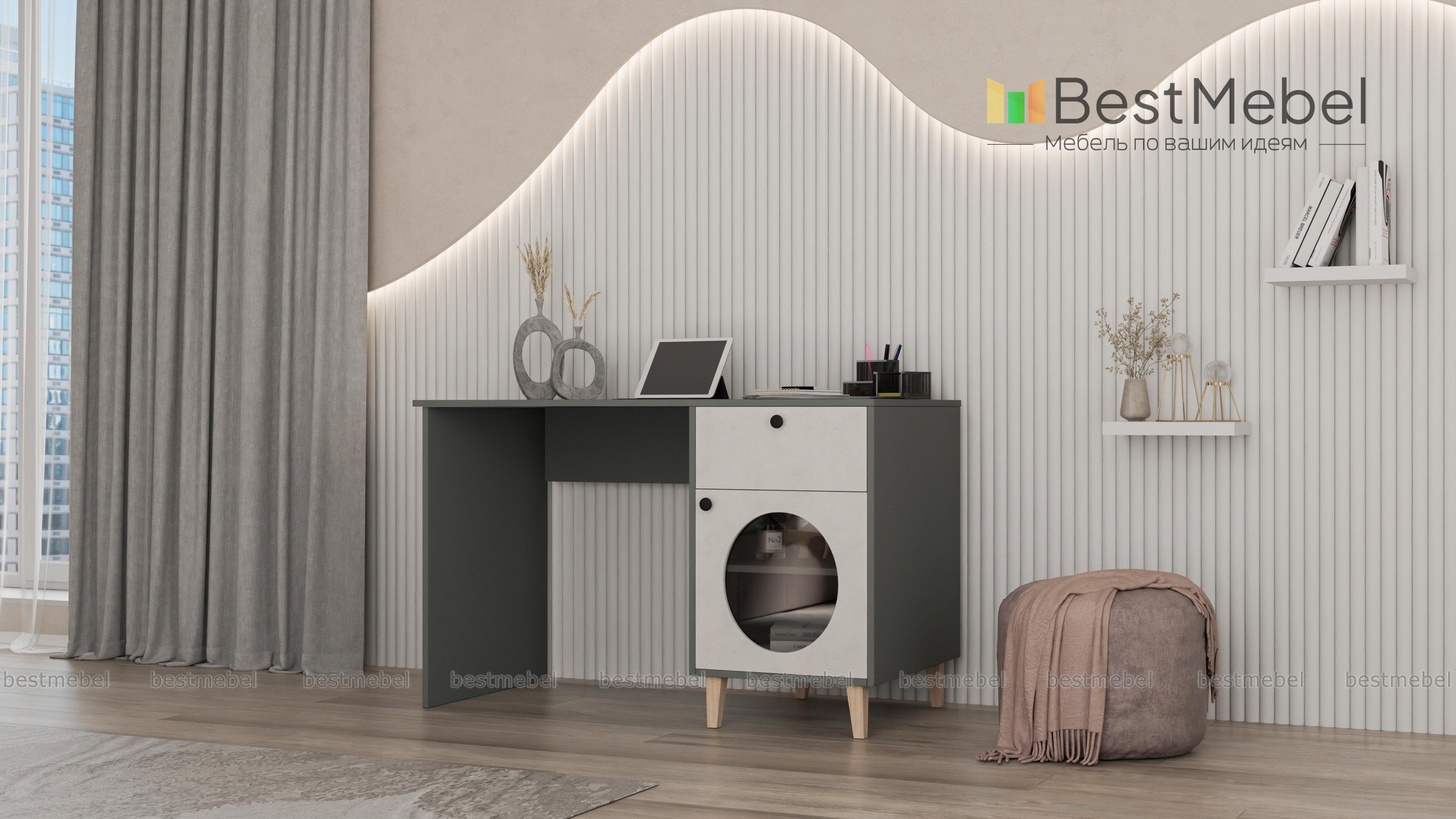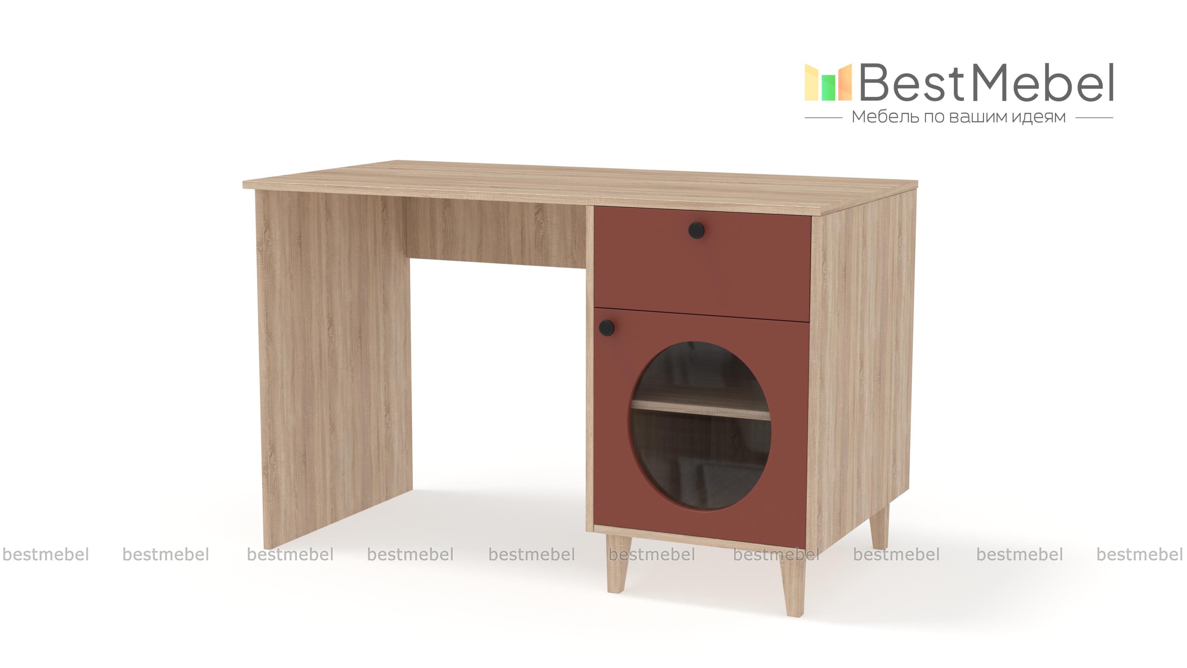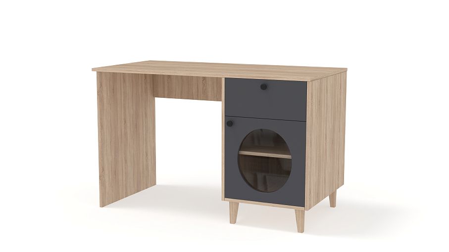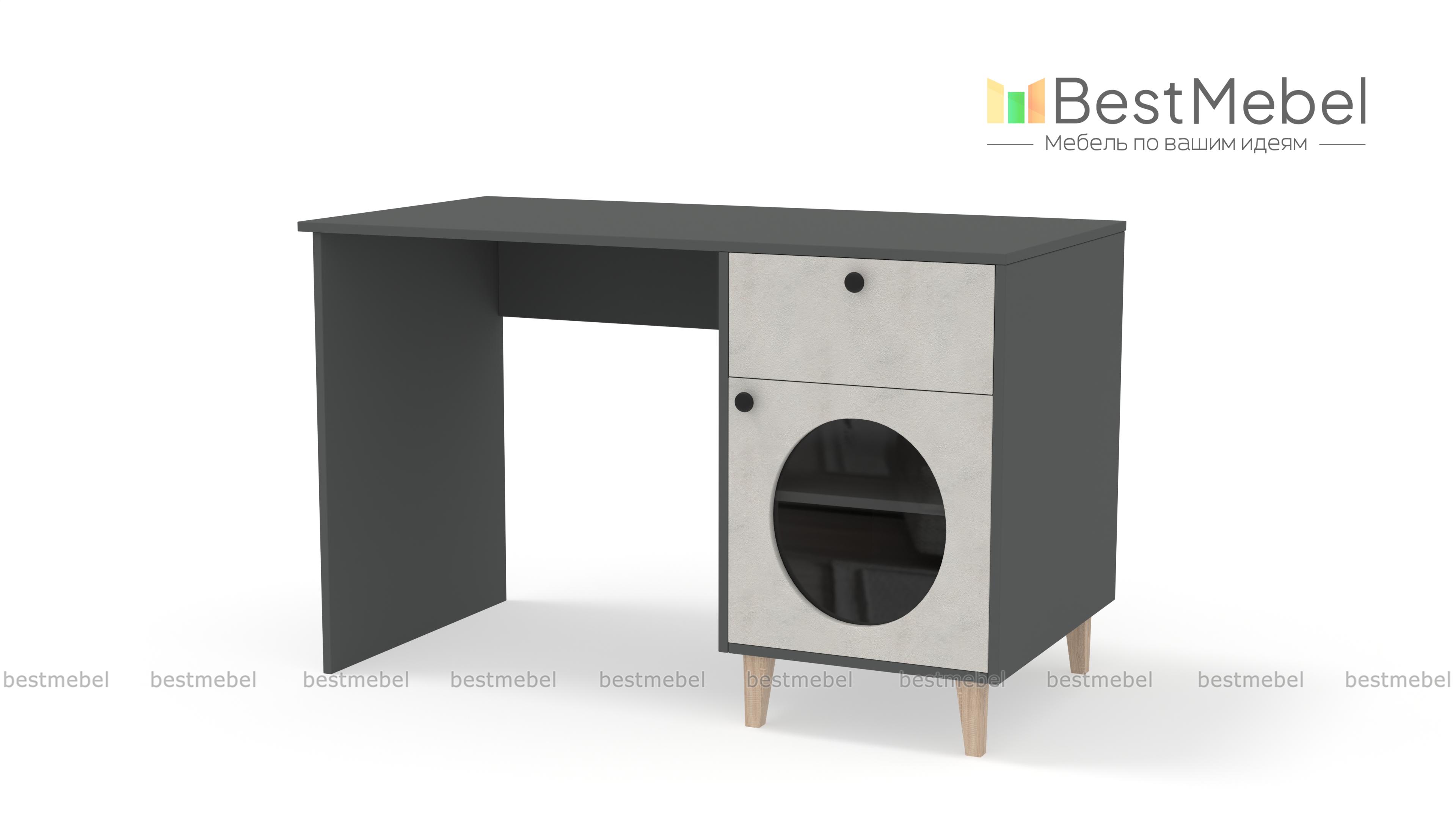 Стол письменный Брукс 1 BMS — это удобное рабочее место и яркий предмет обстановки. Под широкой прямоугольной столешницей располагается тумба, оборудованная ящиком для хранения канцелярских мелочей и распашной секцией со стеклом. Нейтральный цвет корпуса и столешницы комфортен для глаз, а стильный контраст создает темный фасад с фигурным вырезом. Купить стол письменный Брукс 1 BMS для работы дома или в офисе вы всегда сможете на сайте нашего интернет-магазина.