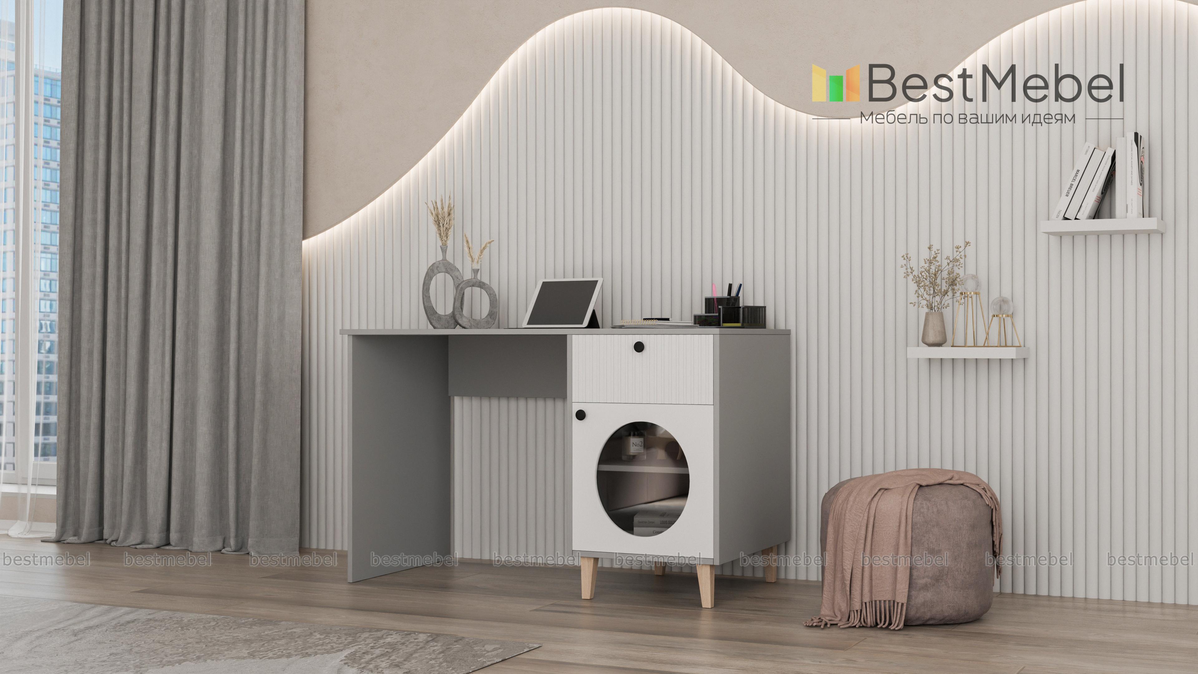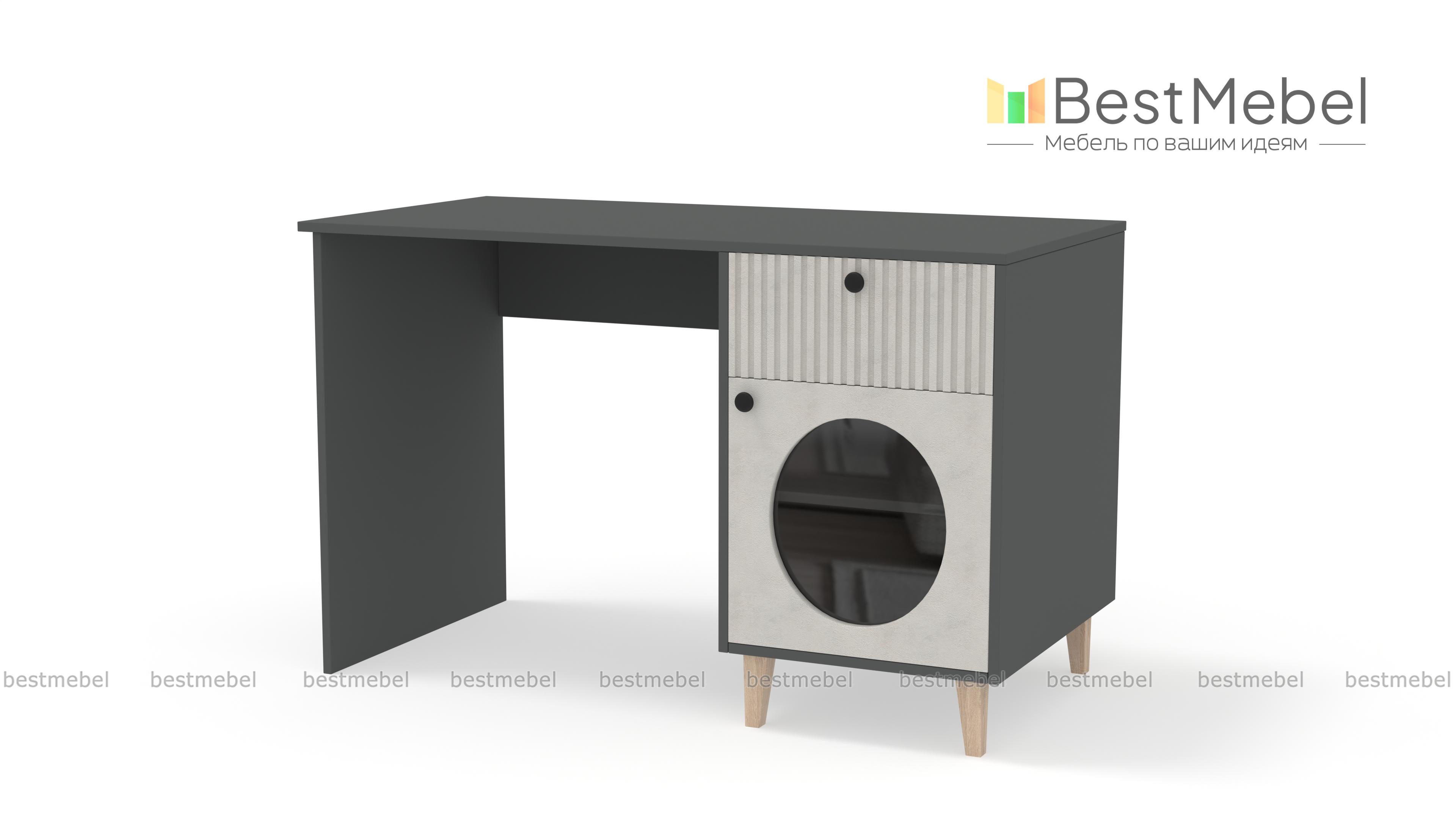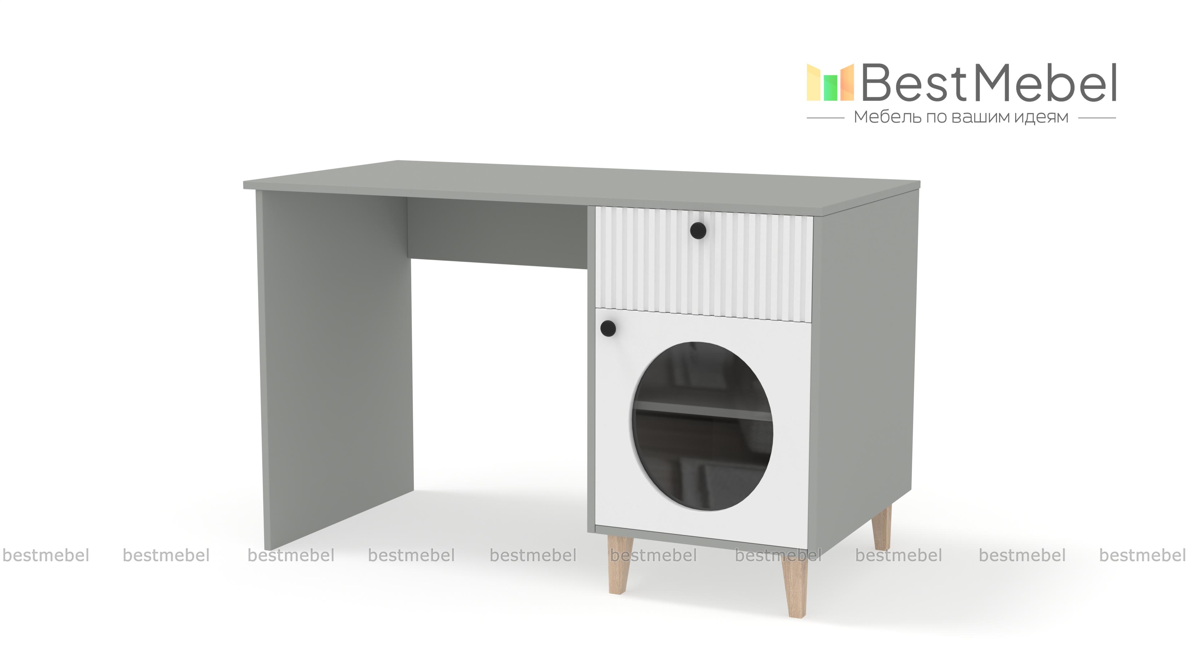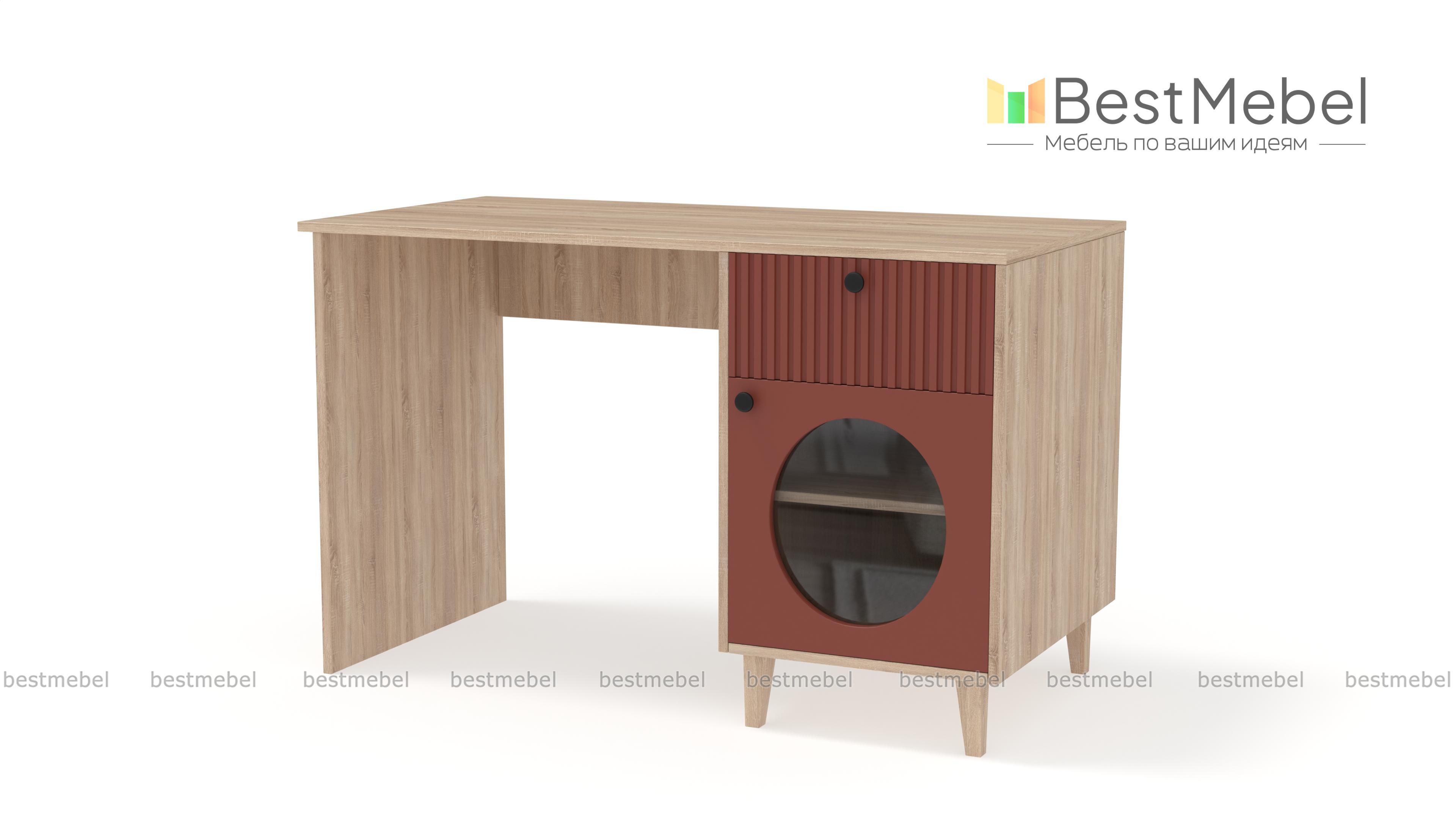 Стол письменный Брукс 2 BMS — функциональный и очень стильный с геометрическим декором и фрезеровкой. Все канцелярские мелочи под рукой в выдвижном ящике справа, а бумаги на виду в распашном отделении со стеклом. Просторная рабочая поверхность стола выполнена из прочной и устойчивой к появлению царапин ламинированной ДСП в природном древесном оттенке. Купить стол письменный Брукс 2 BMS, изготовленный по вашим размерам, приглашаем к нам в интернет-магазин.
