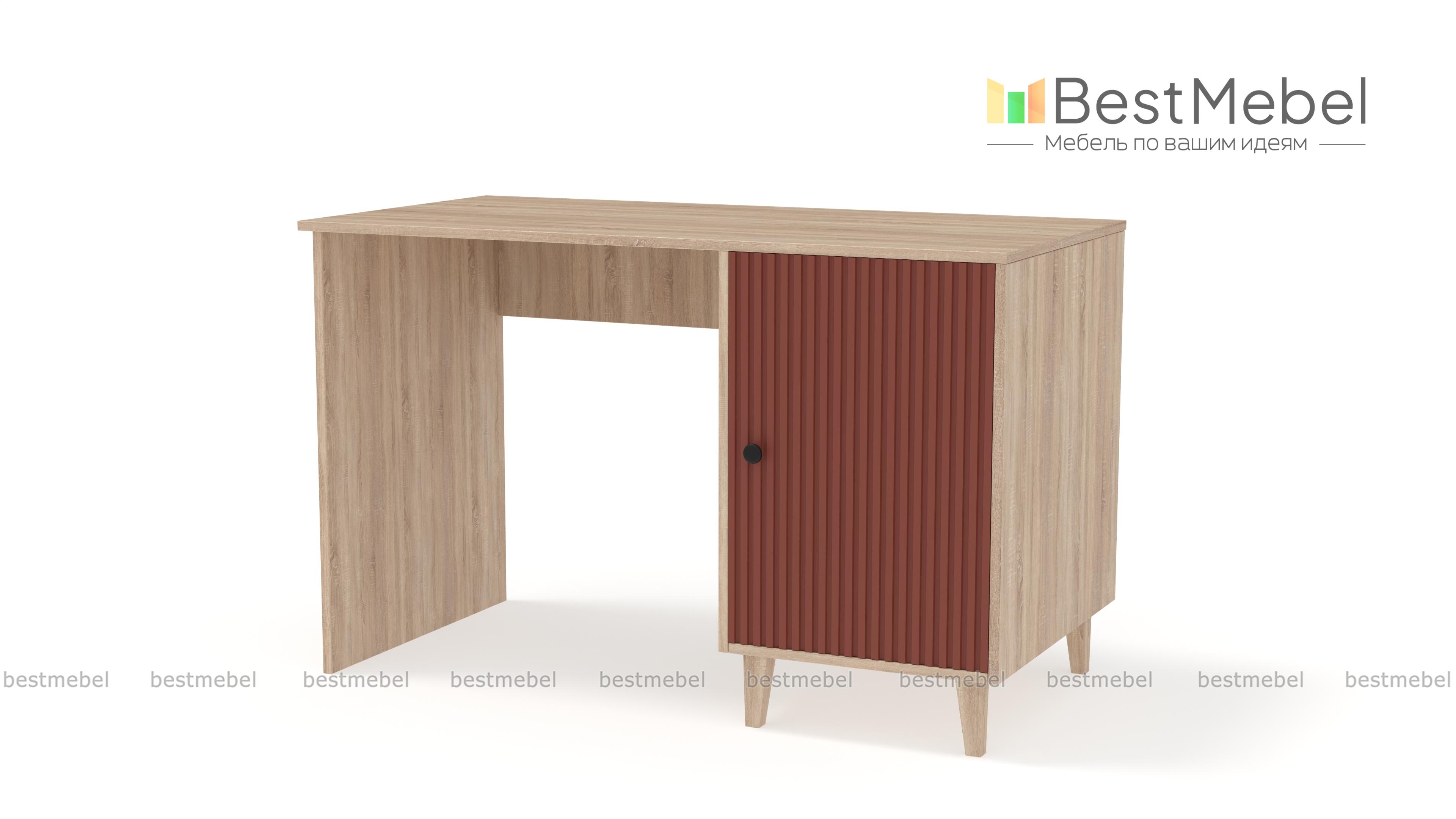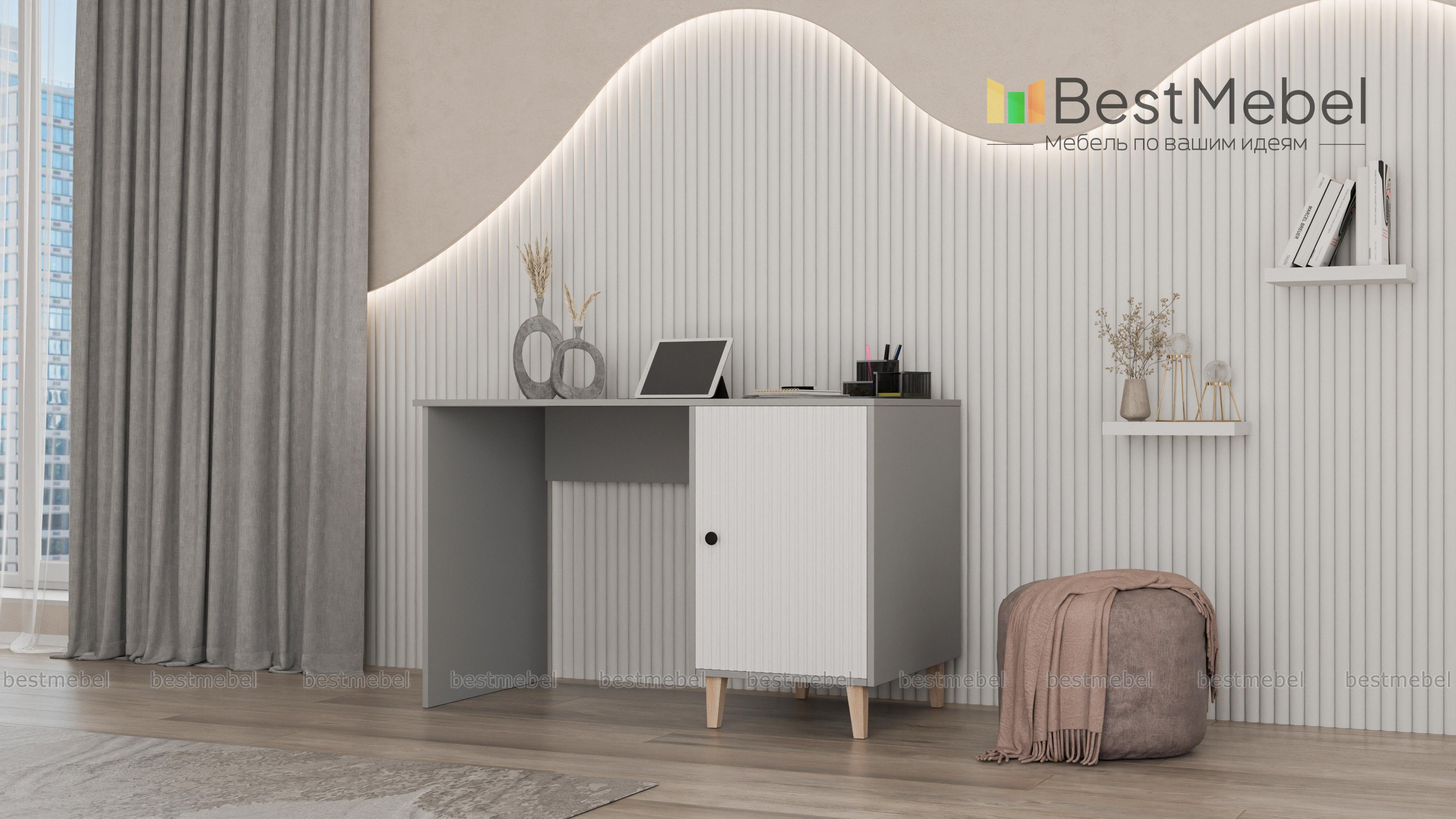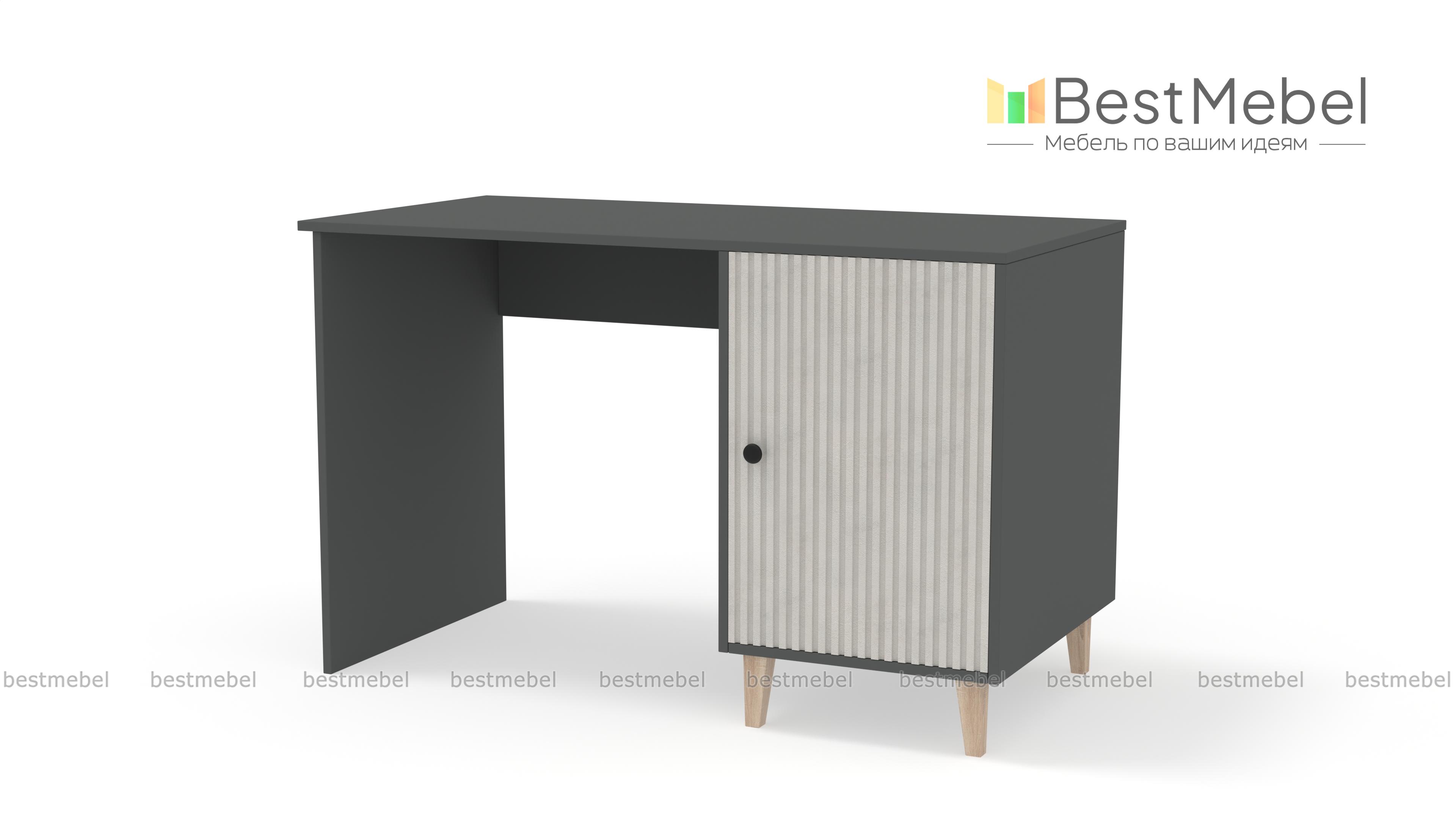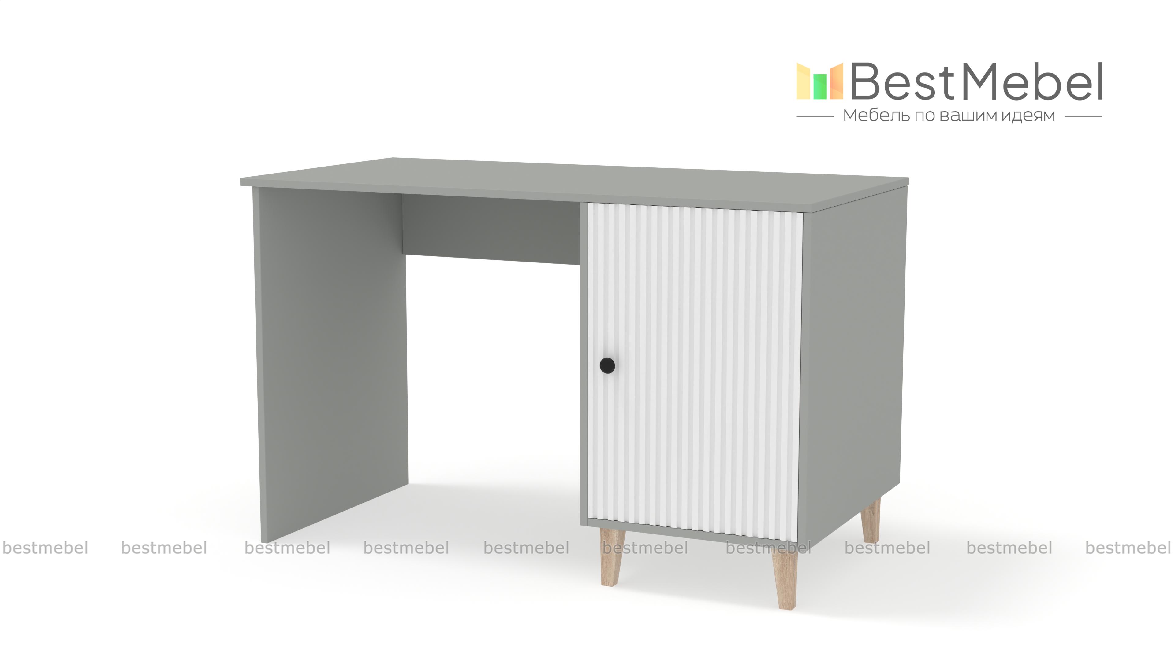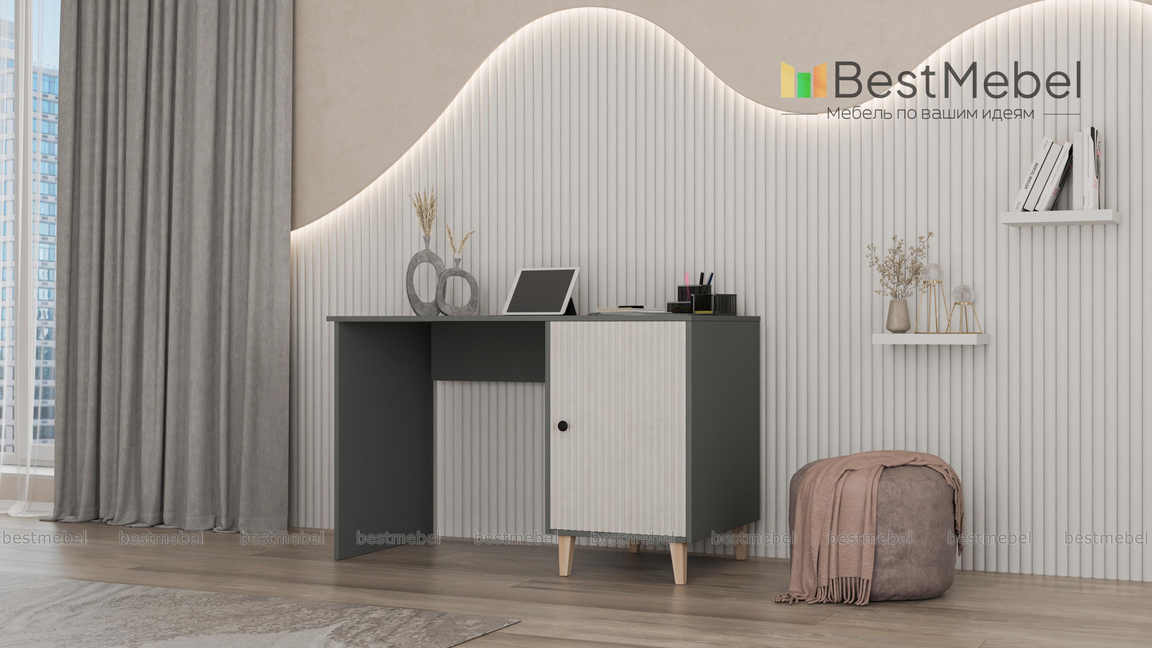 Стол письменный Брукс 5 BMS поможет создать комфортное и стильное пространство для работы дома. Модель классической формы с широкой столешницей и вместительной распашной тумбой на ножках выглядит современно благодаря актуальной цветовой гамме и декору. Фасад дверцы с вертикальной фрезеровкой и круглой ручкой — эффектное и практичное решение. Купить стол письменный Брукс 5 BMS с изготовлением по индивидуальным размерам приглашаем в наш интернет-магазин.