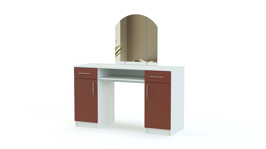 Элегантная яркая модель для современной спальни. В комплект этого функционального столика входят трехстворчатое зеркало, с которым будет удобно делать прически, две боковых тумбы с выдвижными и распашными ящиками и открытая центральная полка. Вместительный туалетный столик Paris BMS разместит все необходимое для макияжа, парфюмерию, аксессуары и множество нужных мелочей. Выполнен трельяж в белом корпусе, фасады тумб – контрастный матовый в нескольких вариантах на выбор.