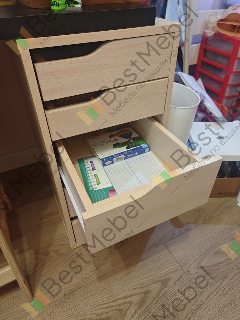 в этом заказе всё индивидуально: глянцевый корпус, в т.ч. задняя стенка, скрытые крепежи, шариковые направляющие с доводчиком, фотопечать, материал мдф. Получилось мощно! Мы довольны. Выполняет функцию разделителя под детским столом.