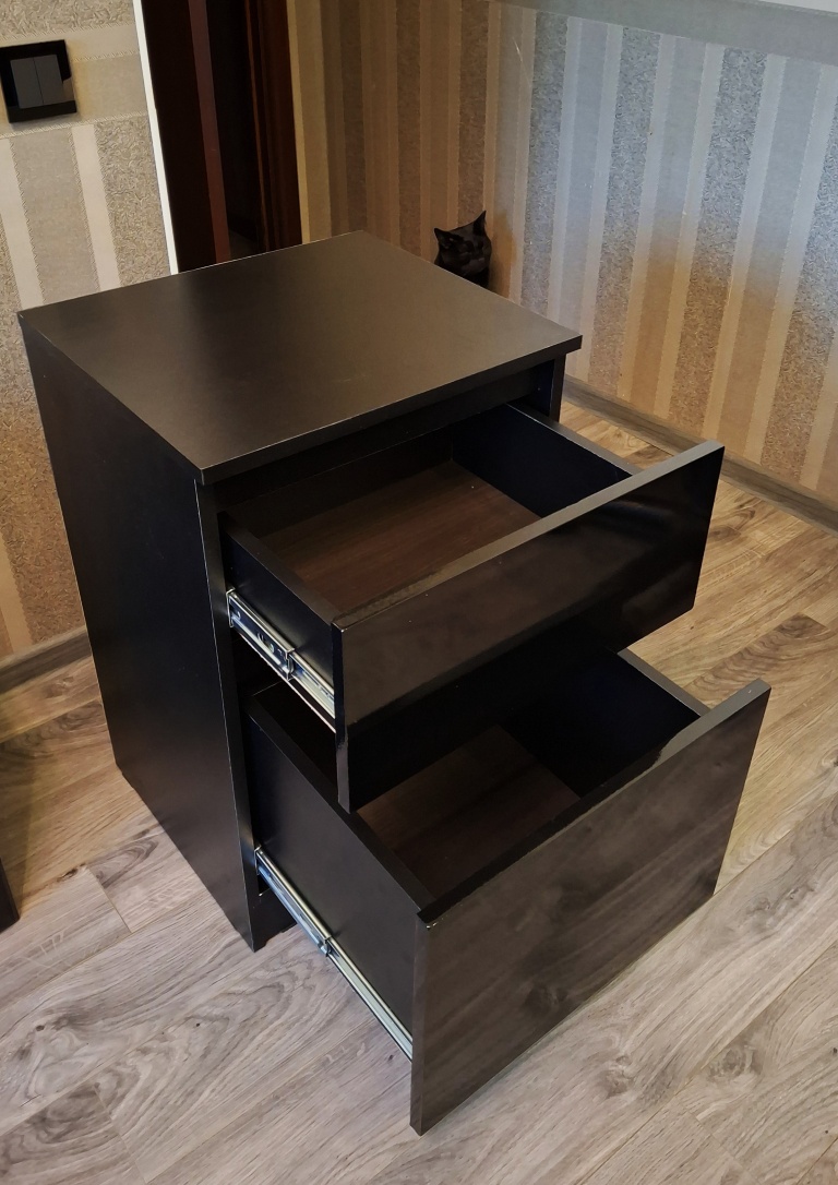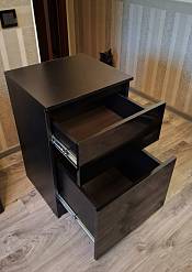 Заказывалась тумба прикроватная Куллен Kullen 3. Собралась без проблем, все устраивает. Заказ 00000207705, 00000207706. Тумбы заказывались под мои размеры, так как не смог найти в мебельных магазинах подходящих габаритов. После сборки думал будут проблемы с наклейками на каждой детали - отклеил без проблем и следа не осталось. Тумбами доволен.
